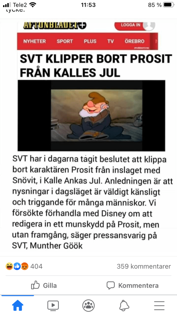 Imorse så såg jag även detta på facebook. Det har ju gått ett rykte på sociala medier att kalle anka skulle ställas in men det var ju INTE sant. Däremot så såg jag detta idag och jag tänker bara jösses… Snart har dom ju klippt bort allt. Tycker det är väldigt tråkigt. Tror att det är många som tycker att detta är onödigt precis som jag. Jag vet inte men jag tänker inte alls på corona när jag tänker på prosit då tänker jag på kalle anka eller snövit. Jaja. När jag kom hem från promenaden så vilade jag lite då jag var väldigt trött. Efter det la jag upp en video som jag länkar här nere👇