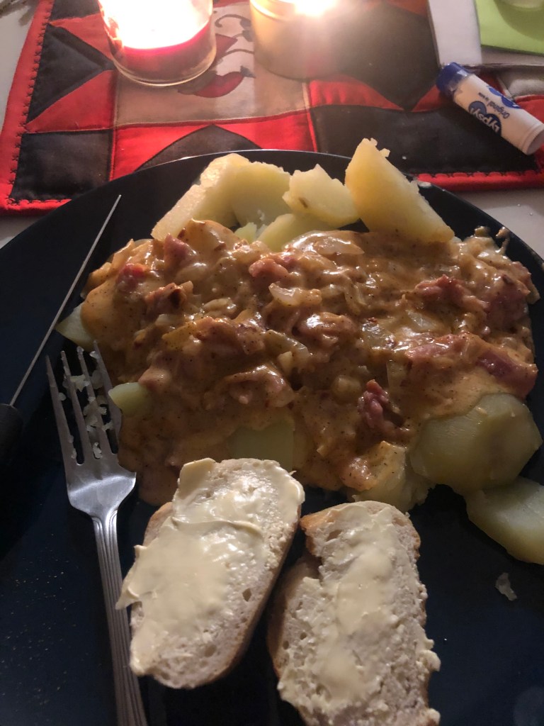 Ikväll lagade jag mat gjorde en väldigt god baconsås med bacon och lök och så hade jag potatis till blev verkligen gott kan jag säga.