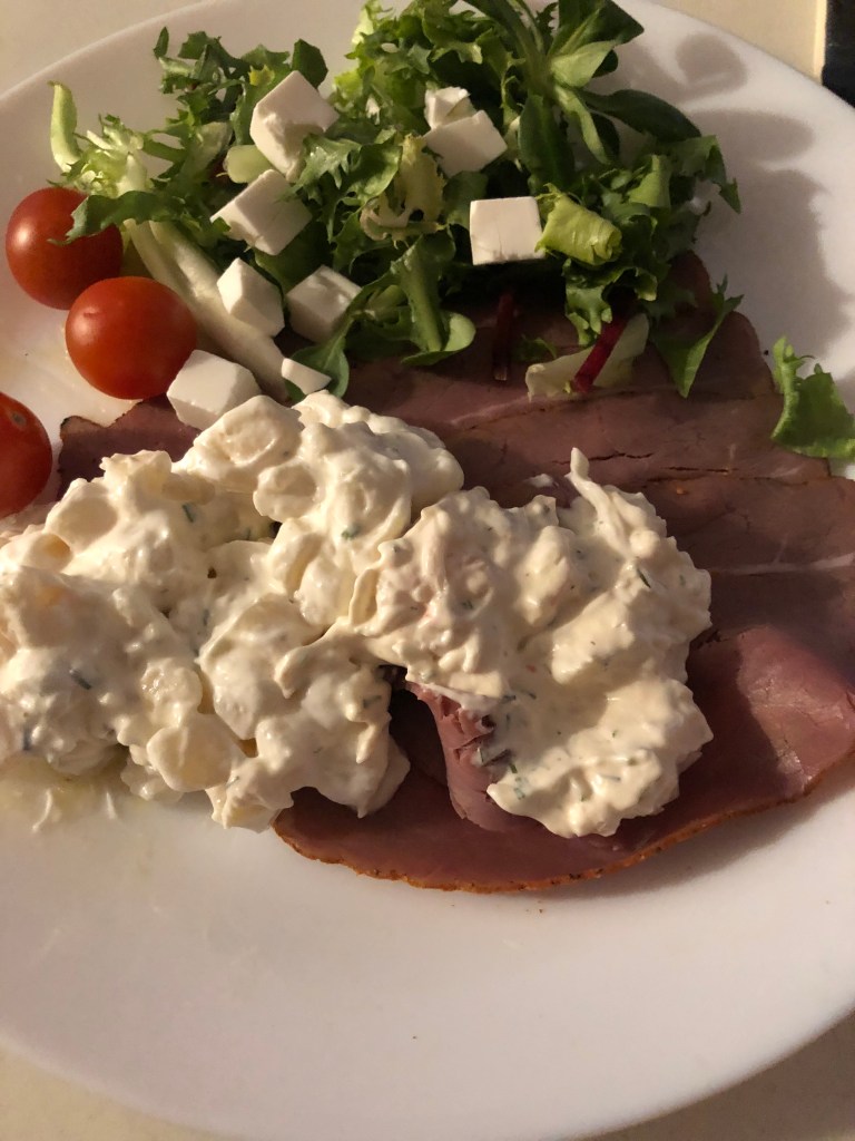 Detta blev dagens middag och även gårdagens middag. ICA hade extra pris på rostbiff så jag passade på. Riktigt gott. Med rostbiff och potatissallad till. 😍Jag verkligen ÄLSKAR potatissallad.